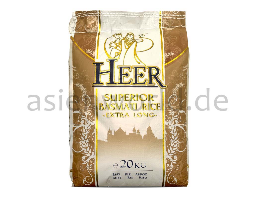 Heer Superior Extra Long Basmati rice 20 kg is the first choice for consumers as it is very long-grained, fragrant and non-sticky after cooking. It is the longest available grain that has been cooked once and used in a variety of specialty dishes. No liability is accepted for the information provided. Please check the information on the respective product packaging in individual cases, only these are binding.